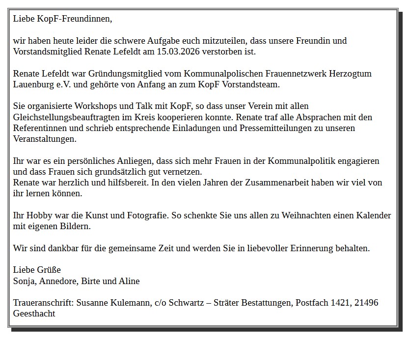 Noch immer sind Frauen und Männer nicht gleichberechtigt. Der 2014 gegründete Verein „KopF Herzogtum Lauenburg e. V.“ hat es sich zur Aufgabe gemacht, die Gleichberechtigung zu fördern. Insbesondere soll der Frauenanteil in politischen Gremien erhöht werden. Dazu sollen Frauen durch Bildungsangebote mit den Aufgaben der kommunalen Selbstverwaltung vertraut gemacht werden. KopF will sie für die aktive politische Arbeit interessieren und ihnen den Weg in die Politik erleichtern.